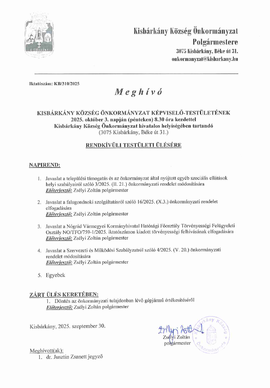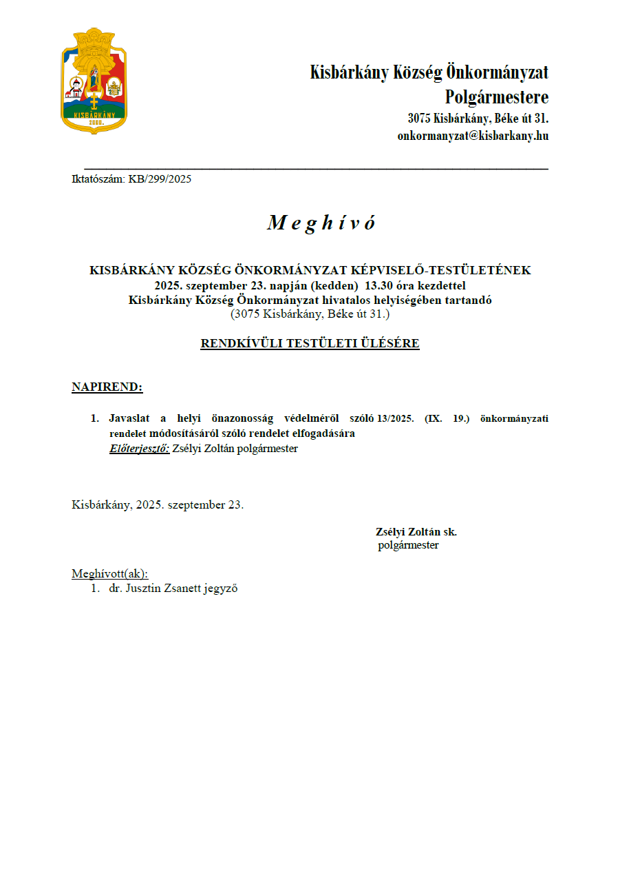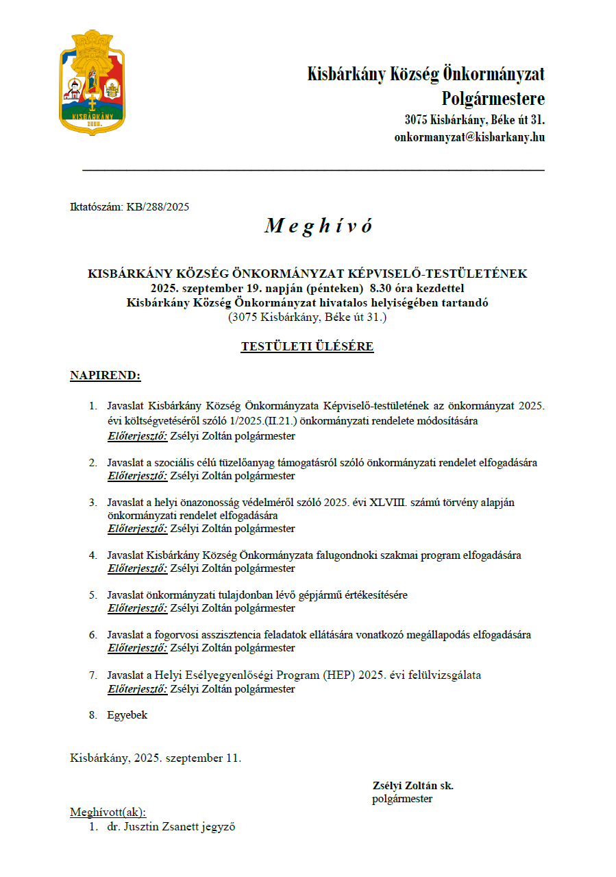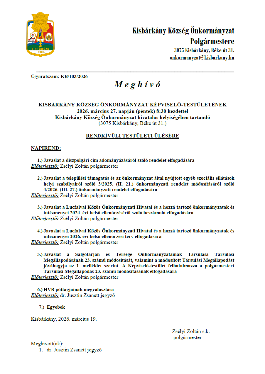 Előterjesztés Kisbárkány alpolgármester tiszteletdíjának megállapítására